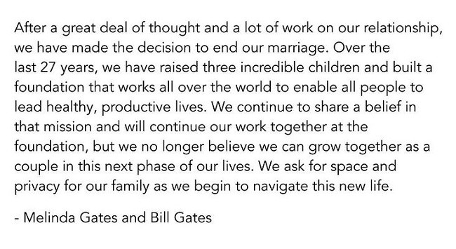 Erau unul dintre cele mai solide cupluri până la vestea divorțului din 4 mai. Împreună, Melinda și Bill Gates valorau peste 140 de miliarde de dolari, înființaseră o fundație prin intermediul căreia au făcut donații de aproape 50 de miliarde de dolari și au crescut 3 copii frumoși și la fel de înzestrați precum părinții lor.