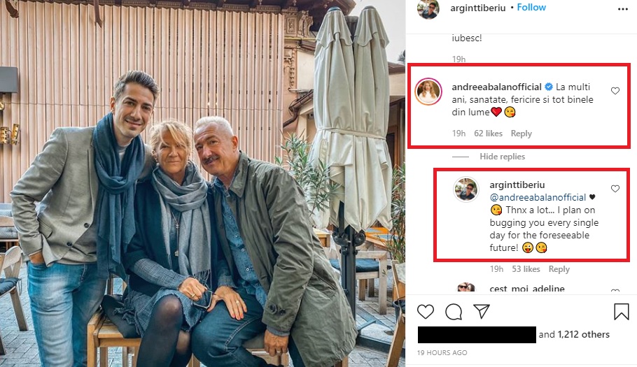 "La mulți ani, sănătate, fericire și tot binele din lume❤️", este comentariul postat de Andreea Bălan. " Thnx a lot... I plan on bugging you every single day for the foreseeable future! (n.r. Mulțumesc mult... Plănuiesc să te deranjez în fiecare zi în viitorul apropiat)", a scris și Tiberiu Argint.