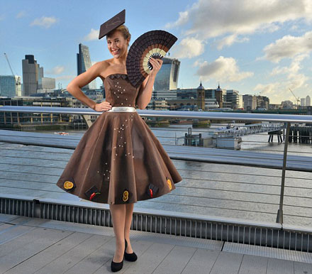 Rochia creata numai din ciocolata a fost dezvaluita saptamana aceasta in cadrul festivalului de moda gazduit de Salon du Chocolat, de la Londra. Pentru a realiza aceasta rochie delicioasa de 50 de kg, designerul a avut nevoie de doua saptamani, ea lucrand aproape non-stop la decorarea si finalizarea creatiei.