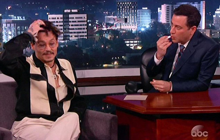 La scurt timp dupa ce Depp a intrat in platoul show-ului tv, prezentatorul a inceput sa isi aplice pe buze balsam de buze in timp ce intr-o nota ironica, marturisea ca este gelos pe relatia dintre actor si Amber. "Nu vreau ca lucrurile sa fie ciudate intre noi, insa data trecuta cand ai venit in emisiune, tin minte ca ne-am sarutat de cateva ori. Chiar am crezut ca ne potrivim, ca intre noi exista o chimie.. Dar la scurt timp am fost luat prin surprindere cand am auzit ca te-ai logodit!", a marturisit Jimmy Kimmel. "Mi-ar placea sa vin cu voi in luna de miere. Cred ca asa ar fi cel mai bine pentru... toti!", a continuat prezentatorul. La cateva secunde dupa acest "discurs" sentimental, cei doi s-au sarutat, spre surprinderea publicului.