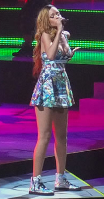 Vestimentatia artistei incepe sa semene tot mai mult cu cea a Rihannei. Aceasta este o fana a tenisilor semnati Chanel si tot ea a fost prima care a purtat o rochie cu dolari imprimati. Tinuta ei a fost realizata de Adam Selman pentru turneul Diamonds World, care a inceput in luna martie a acestui an. In acest caz, designerul care sta in spatele multor outfituri purtate de Rihanna, a ales sa combine imprimeul cu bacnote de un dolar, cu unul fluorescent.