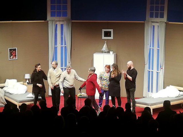 Mitică Popescu alături de Cristi Iacob, Alexandru Conovaru și Anca Sigartău, actorii din piesa “Alex și Morris”, de Michael Elkin.
