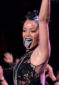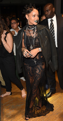 Daca rochia ce ii dezvaluia lenjeria intima nu i-a creat probleme, nu acelasi lucru s-a intamplat si cu rujul excentric pe care vedeta a ales sa il poarte. Acesta nu era rezistent la transfer, asa ca limba Rihannei a devenit in scurt timp la fel de verde precum ii erau buzele. Vedeta a facut haz de necaz pe Instagram, unde a explicat faptul ca si-a atins buzele cu limba de cateva ori si din aceasta cauza a ajuns sa arate de parca ar fi baut cerneala.