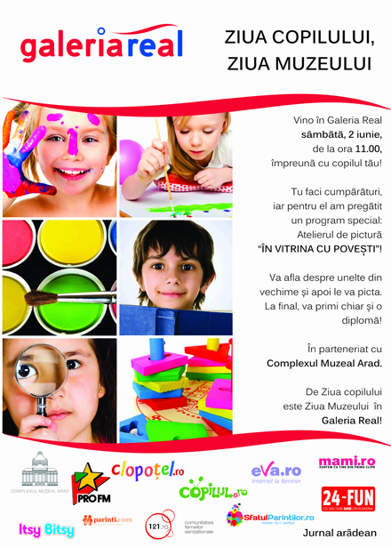 Cu prilejul zilei de 1 iunie, ZIUA COPILULUI, Complexul Muzeal Arad invita copiii mari si mici sa viziteze expozitiile muzeului deschise la Arad (Arheologie, Stiintele Naturii - Palatul Cultural/Piata G. Enescu 1; Muzeul de arta Arad - Str. Gh. Popa 2-4, et, II), dar si in judet la Siria, Lipova.