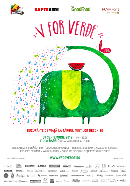 Cu un vizual semnat de artistul ilustrator Madalina Andronic, prima editie V for VERDE isi asteapta vizitatorii in data de 30 septembrie la Villa Barrio (strada Biserica Amzei, nr. 30). Intrarea se face in baza biletului de intrare in valoare de 10 lei. Detalii apetisante despre cum sa te bucuri de viata pe www.vforverde.ro .