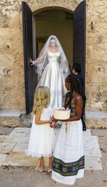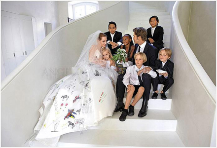 Spre altar, Angelina a fost "escortata" de cei doi baieti adoptati, Maddox si Pax, in timp ce micutele Vivienne si Zahara s-au ocupat sa presare un covor de flori inaintea mamei lor. Cavaler si domnisoara de onoare au fost bineinteles, ceilalti copii ai cuplului, Shiloh si Knox. De remarcat este faptul ca Angelina a tinut mortis ca fiica ei adoptiva, Zahara, sa imbrace o rochie de inspiratie ethiopiana, respectand radacinile sale.