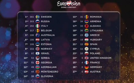 Surpriza acestui an in cadrul concursului Eurovision a fost Polina Gagarina, reprezentanta Rusiei, care a reusit sa obtina 306 puncte, aducand Rusia pe locul 2 gratie piesei "A million voices". Locul 3 este ocupat de Italia cu 292 puncte, piesa "Grande Amore" fiind de asemenea preferata europenilor.